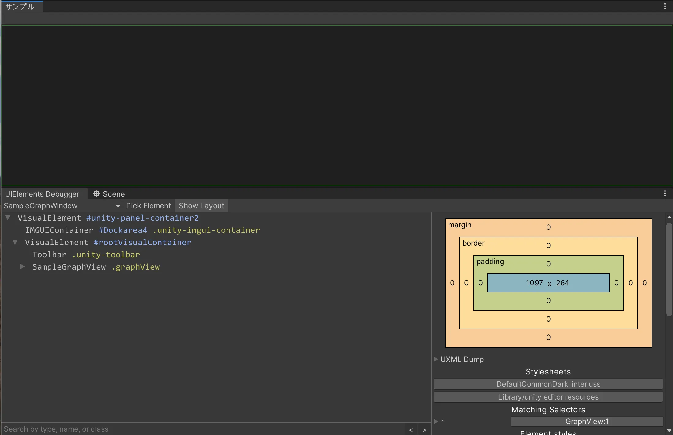 まだ肝心のノードがないので分かりづらいですが、UI Elements Debuggerで確認するとGraphViewがVisualTreeの要素として存在していることがわかります。以上がノードを表示する領域の準備となるGraphViewの実装になります。最低限UIの要素として追加して表示するまで工程を説明しましたが、継承して実装するだけでシンプルなのが伝わったかと思います。