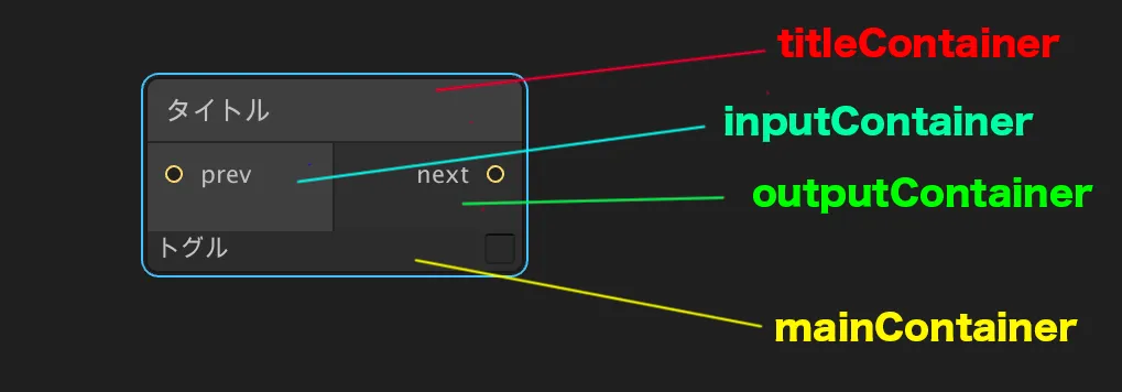 このように、ノードの実装はNodeクラスの機能にしたがって要素の追加やレイアウトの調整を行います。レイアウトの調整を行う際、先ほどの実装でも使用していたmainContainerのようなUIを配置するための親がメンバとしていくつか用意されています。次のコードはNodeクラスのメンバとして用意されているUIを配置するVisualElementのメンバになります。