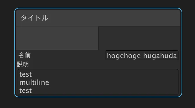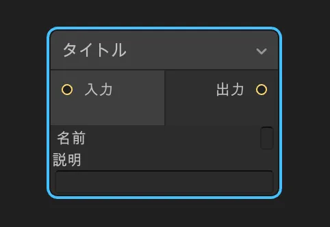 そして、先ほどの実装のノードを実際に表示してみると次の画像のようになります。ヘッダーの部分にタイトルの文字列が並び、真ん中に要素としてテキストと入力された文字領域が配置されています。