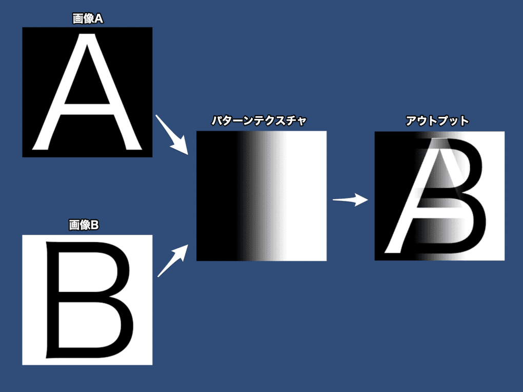 - 作成したパターンテクスチャを元に、画像Aと画像Bをブレンドし、最終アウトプットとする