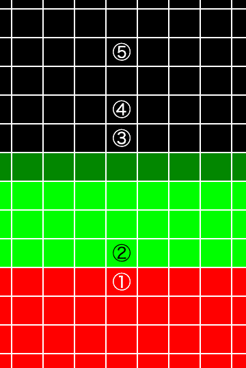 また、地点13から距離2マス地点のGの値と比べて、4は2マス離れた地点のGの値がそれほど大きくありません。よって、13と4を比べた時に4での処理では陰影の強さを弱めてあげると良さそうです。そして、今回陰影を出したいのは最終アウトプットの白い部分の外側、つまりパターンテクスチャでいうところのGの色の外側になります。(R色、もしくは無色の地点)再度図を確認すると、2に関してはGの値の上にある点なので陰影の対象外ということになります。