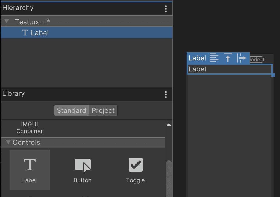 「Library」にある要素を「Hierarchy」にドラッグ&ドロップすることでUIを構築できます。構築されたUIの状態は「Viewport」で確認できます。次の画像は「Label」要素をドラッグ&ドロップした際の状態です。