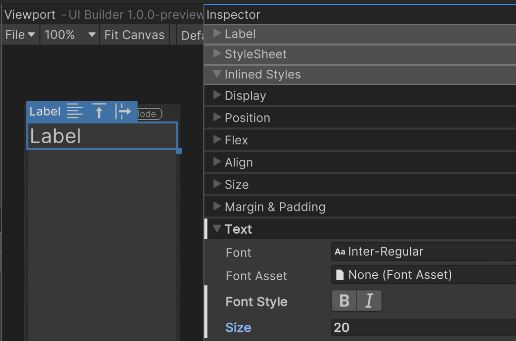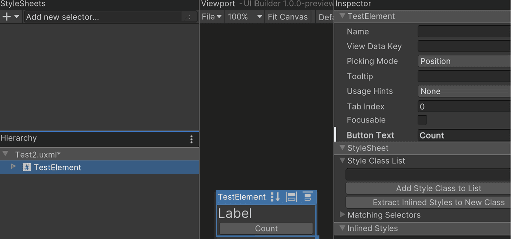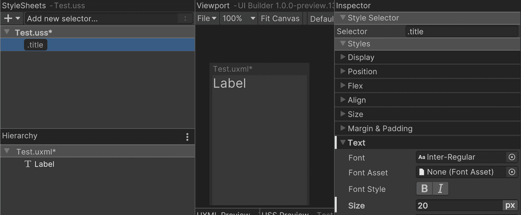 出力されたUXMLにある「font-size: 20px」のようなスタイルに関するプロパティは「USS」形式のファイルに書き出すことができます。このUSSもUI Builderの「StyleSheets」にある「+」ボタンから作成を行えます。試しに「font-size: 20px」を「Test.uss」というUSSファイルに書き出すと次の画像のようになります。