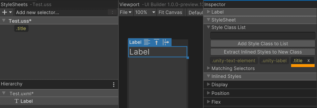 このスタイルをLabel要素へ適用するのはLabelのInspectorで「title」クラスを追加することで行えます。