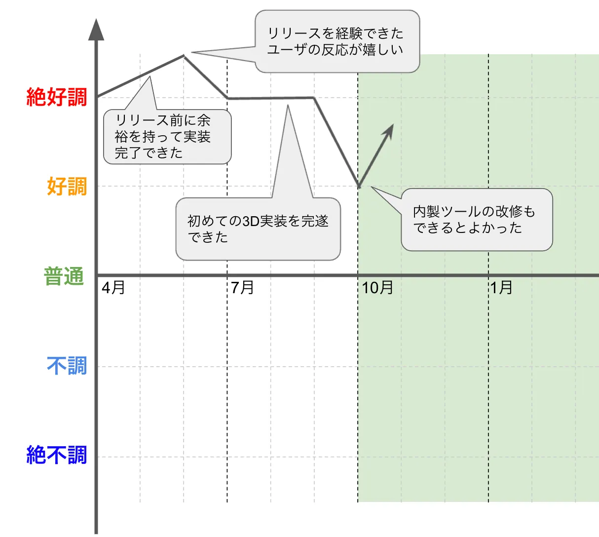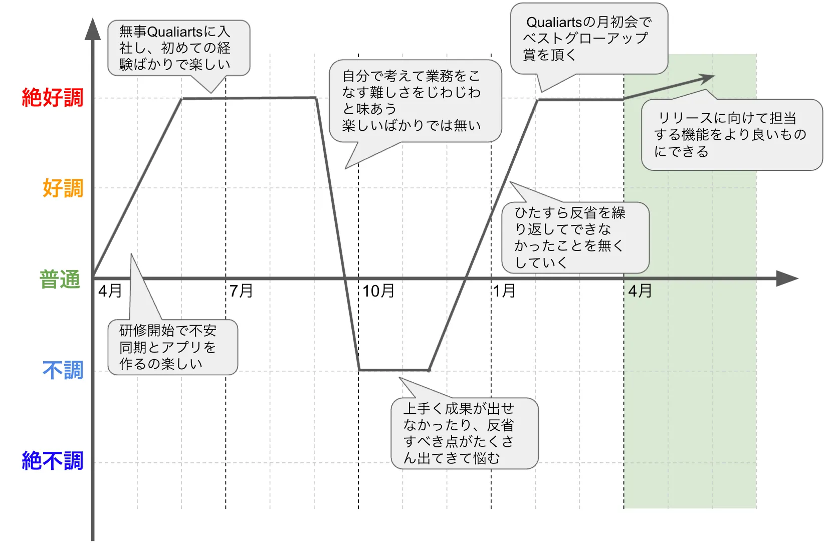 QualiArtsでは半期ごとに目標を掲げてそれに対する達成状況を上司の方々と振り返る機会があります。そこで掲げていた目標と達成状況を元に1年目から振り返ってみます。また、働いていると気持ちの浮き沈みがたくさんあったので、働いているときの気持ちもグラフで可視化してみようと思います。