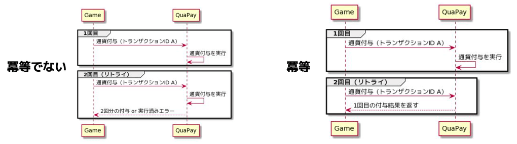 APIを実装する上で大切になるのが冪等性です。つまり同じパラメーターでAPIを何回実行しても、結果が変わらないということです。これは特に課金機能の場合、多重付与や多重消費を防ぐためにも重要です。 これについては、上記の通りQuaPayでは1APIで処理が完結するように設計されているため、特に重要です。万が一エラーが発生した際には、ゲーム側は同じパラメーターで更新系のAPIを実行する可能性があるからです。