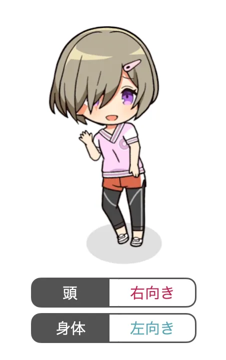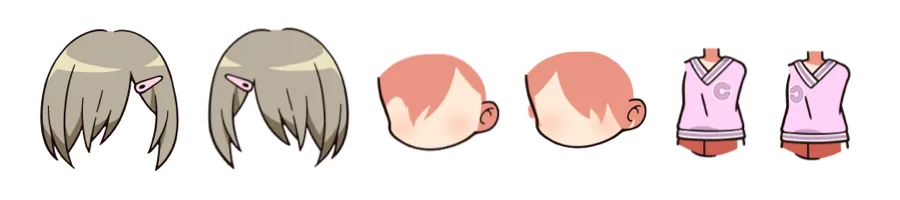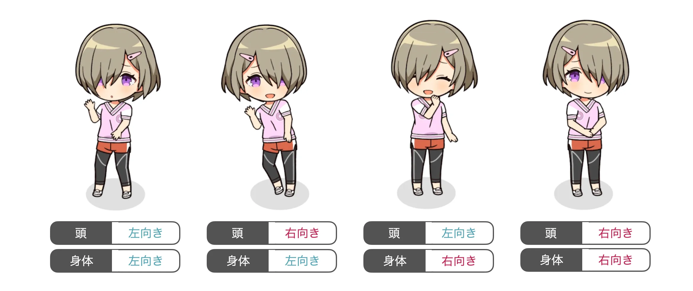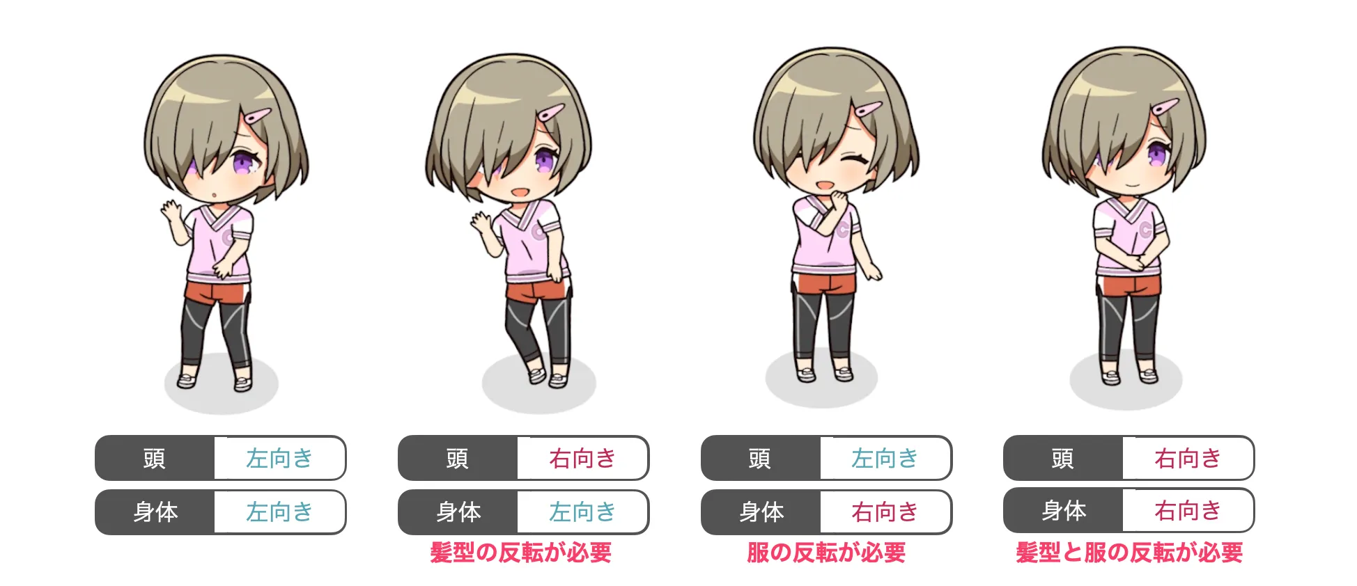 そして、前髪、前髪の影が落ちた顔、服、などの左右非対称で単純に反転して使えないパーツに関しては、左右が反転しているパーツも用意します。