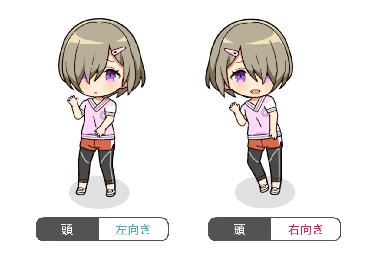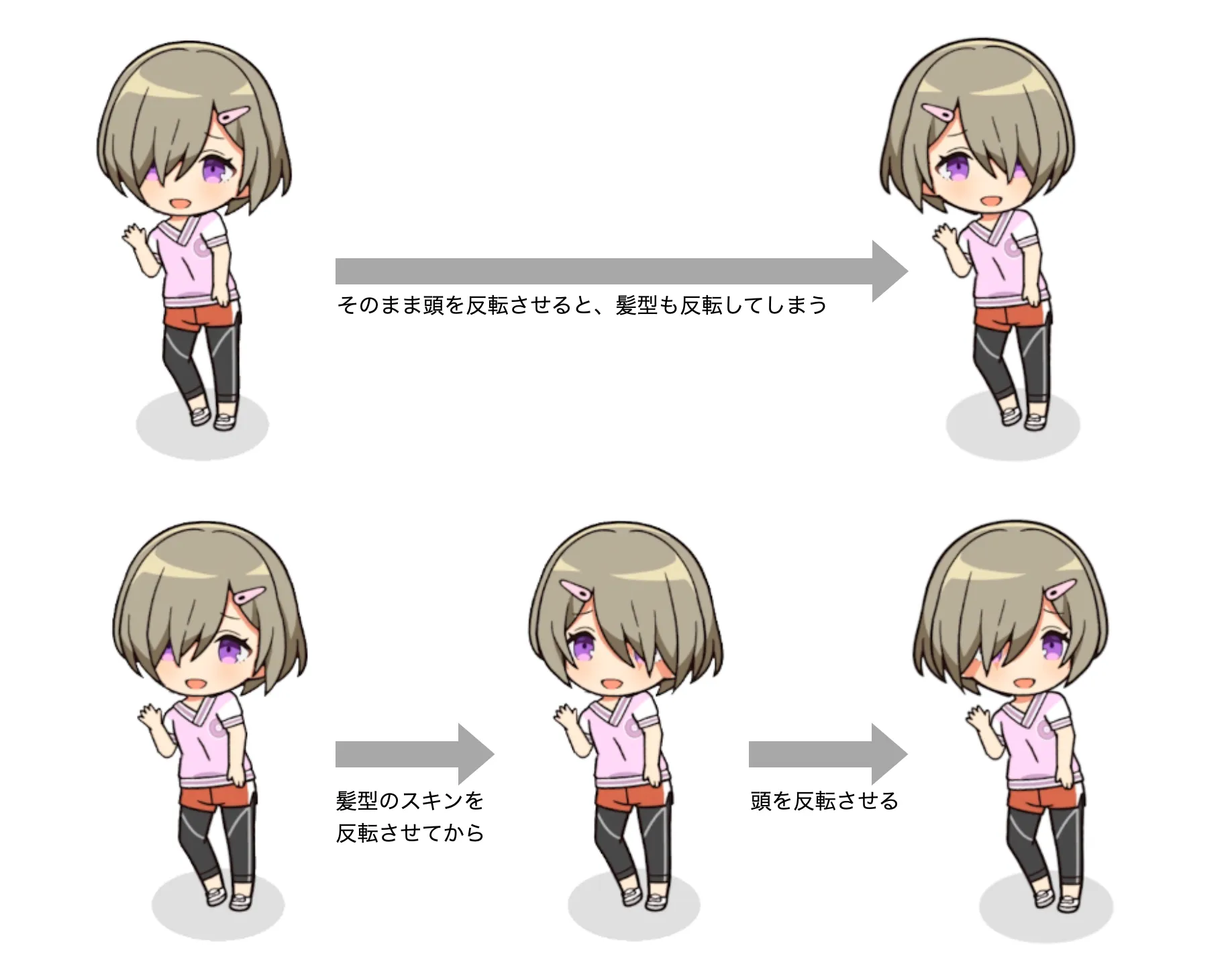 今回、頭を左右反転することで頭の方向転換を実現しています。 しかし単純に反転をしただけだと絵柄自体も反転してしまいます。