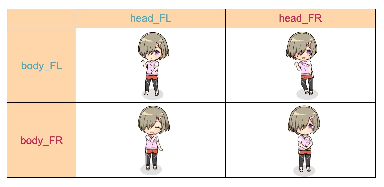 そして今回はhead(頭)とbody(身体)のそれぞれにFL(FrontLeft:左前)とFR(FrontRight:右前)のスキンを用意しました。