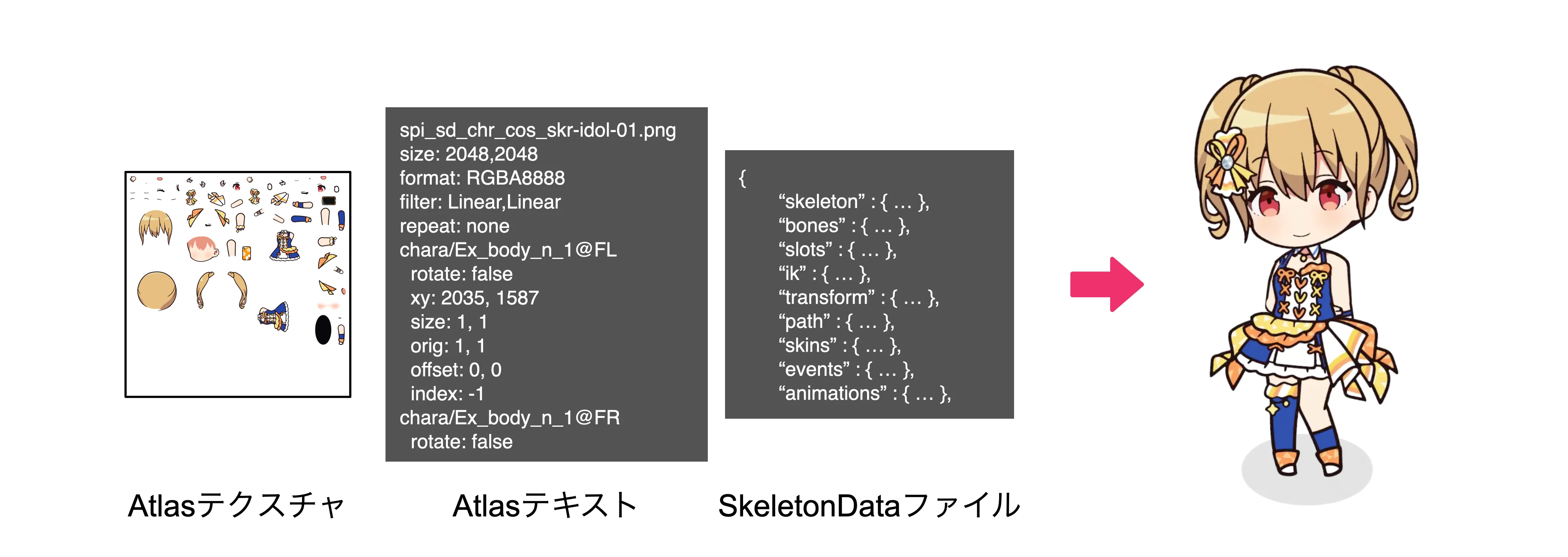 以上の3要素を組み合わせることで、Unity上でSDを生成することができます。 また、Spineからエクスポートされたアニメーション可能なキャラクターやオブジェクトはスケルトンと呼ばれます。