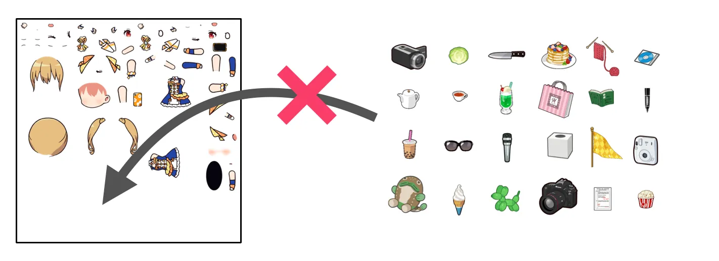 - 全アイテムを入れると、キャラクターのAtlasテクスチャを圧迫してしまう