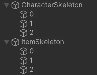 Hierarchyを見ても、元々キャラクターとアイテムで1つずつだったSpineのオブジェクトが複数に分割されていることが分かると思います。