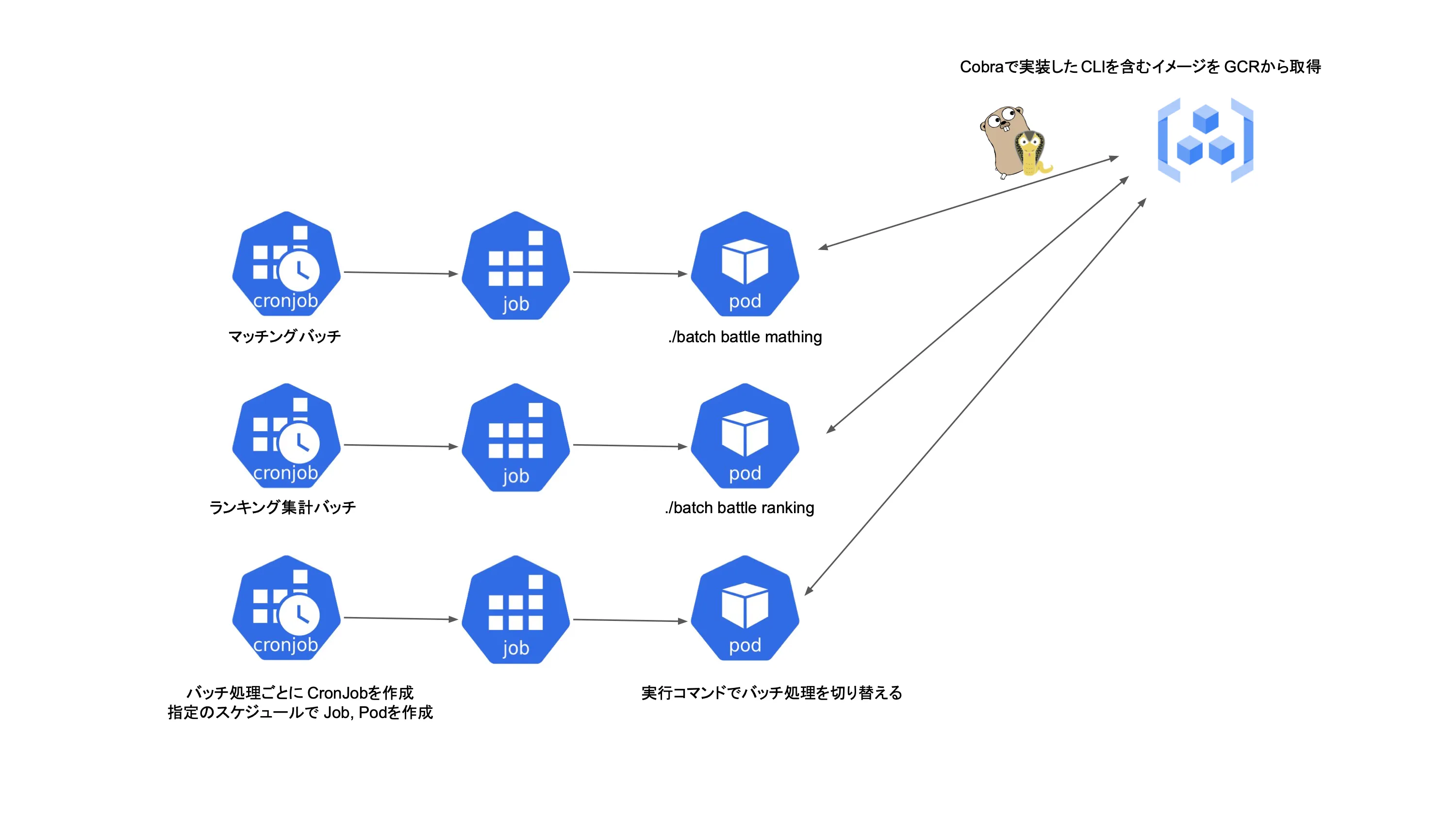 アイプラでは、コンピューティングにGKE、バックエンドのプログラミング言語にGoを採用しています。 バッチ処理においてはKubernetesのCronJobリソースを利用して、Goで作成したCLIプログラムを実行するような方式をとっています。以下にイメージ図を示します。