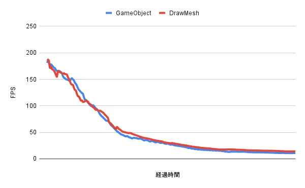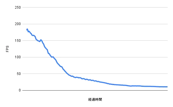 これを実行すると以下のようになります。 やはりオブジェクト数が増えるにつれFPSが低下します。
