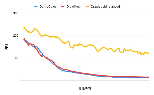 平均FPS133と、GameObjectやDrawMeshと比べて十分早いDrawMeshInstancedですが、やはりオブジェクトが多くなるにつれFPSは低下します。