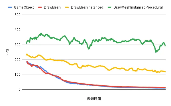 これを実行すると以下のようになります。 GameObjectやDrawMeshよりも高速なことがわかります。