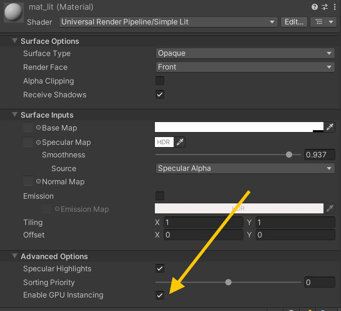 今回のような単一のオブジェクトを大量に高速に描画するという目的に合致したメソッドになります。 これを使うにはまずマテリアルのEnable Instancingにチェックをつけます。