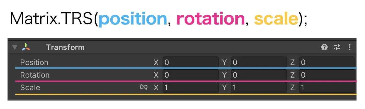 Matrix4x4型は、位置、回転、スケールを表します。 GameObjectにあるTransformコンポーネントと同じ情報を持つと思えばわかりやすいでしょう。