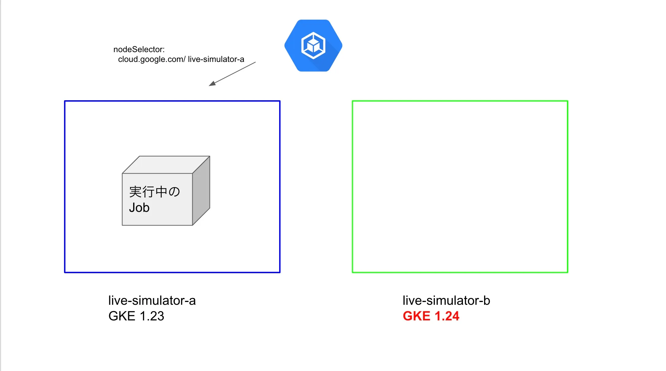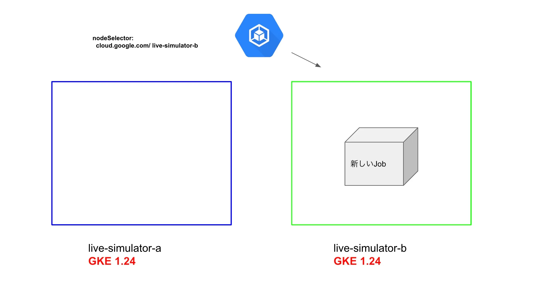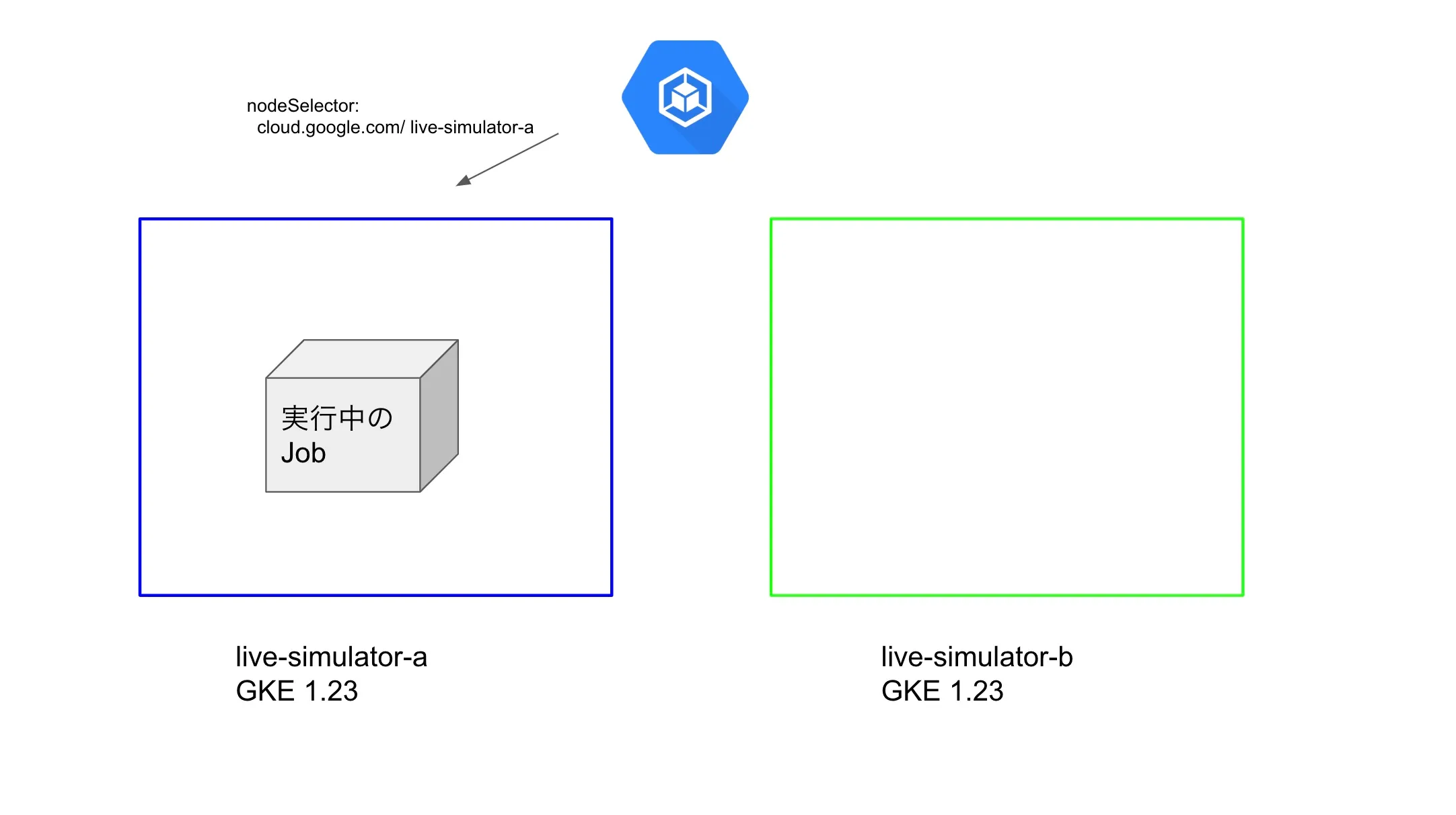 アップグレードが完了したら、JobのnodeSelectorをlive-simulator-bに書き換えて更新します。