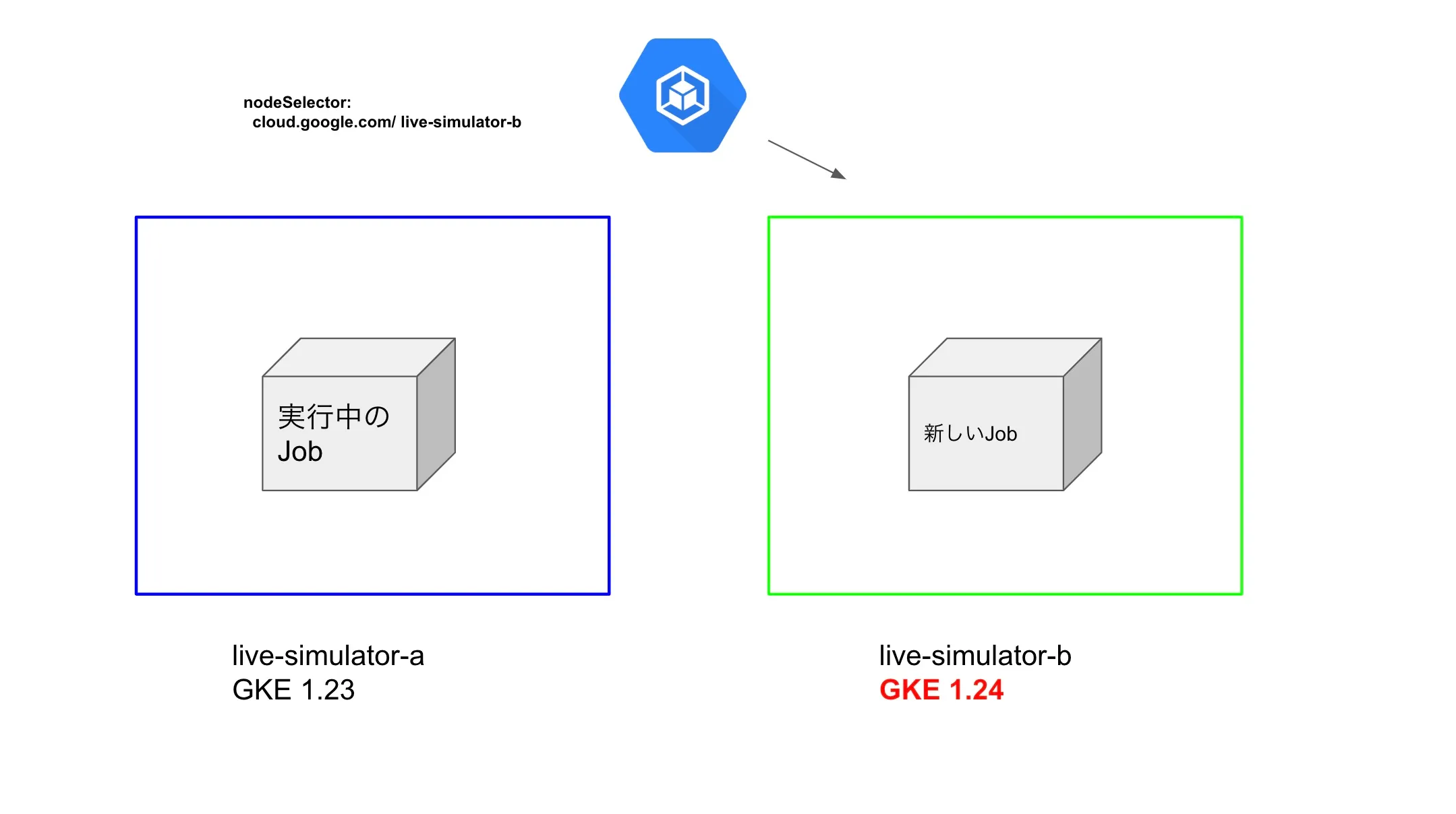 - Kubernetesマニフェストを変更し、Jobをアップグレード済みのノードプールに新しくスケジューリングするように変更する