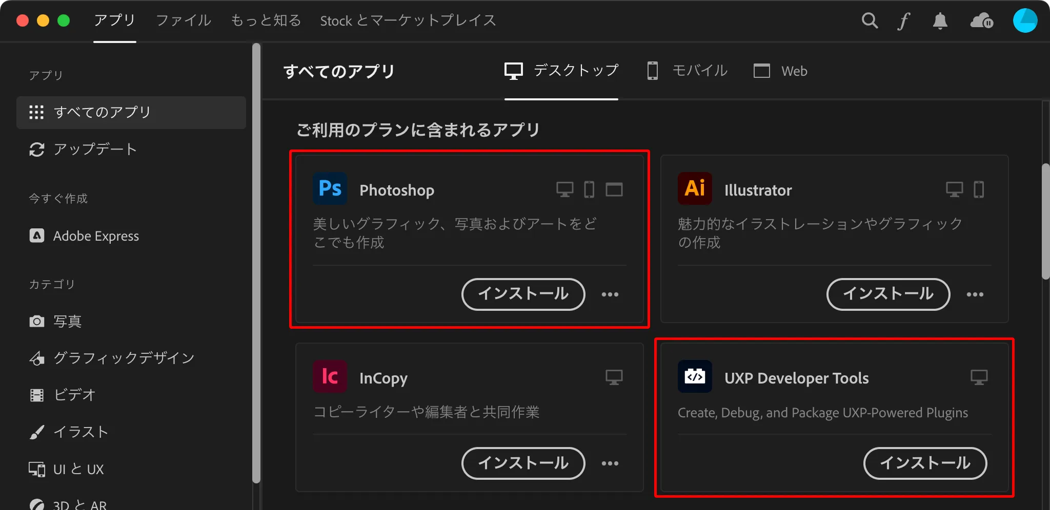 UXP の開発には Photoshop と UXP Developer Tools を使用して行います。まずは Adobe Creative Cloud からそれぞれをインストールをします。 UXP は Photoshop のバージョン 22.0 以降から使用できますが、随時機能が拡充されていっているのでできるだけ最新のバージョンを使用することをお勧めします。弊社では当時最新だった 24.41 を採用しています。UXP Developer Tools は特にインストールするバージョンの指定はできないので最新のバージョンがインストールされるようです。