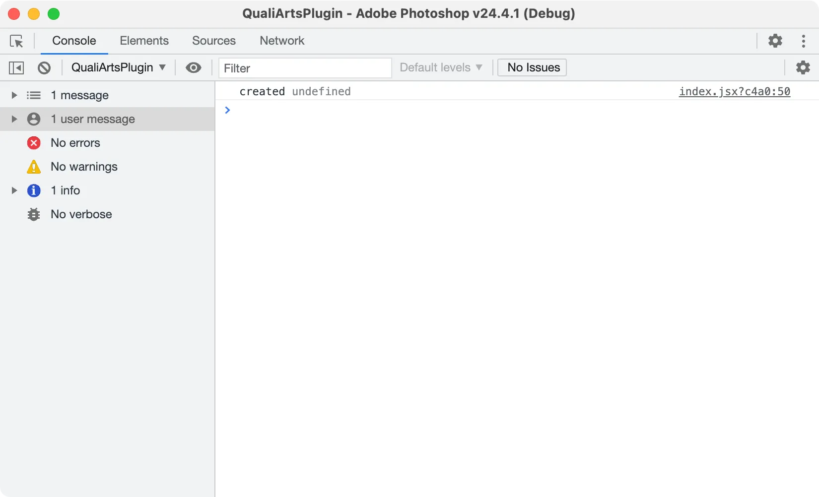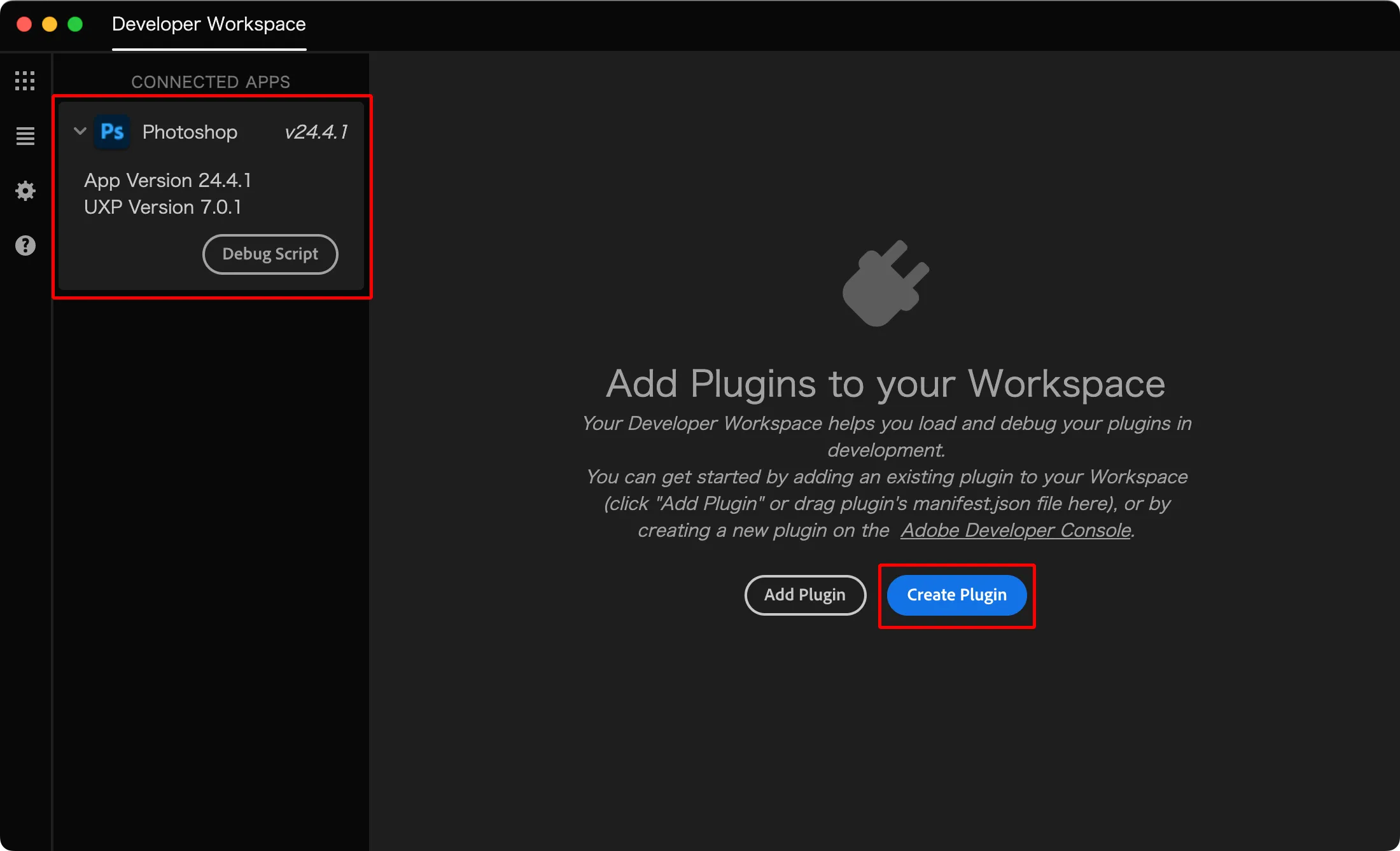 UXP Developer Tools 起動するとこのような画面が表示されます。 Photoshop を起動すると左のペインに起動中の Photoshop が表示されます。開発には UXP Developer Tools と Photoshop を使用するのでどちらも必ず起動しておきます。