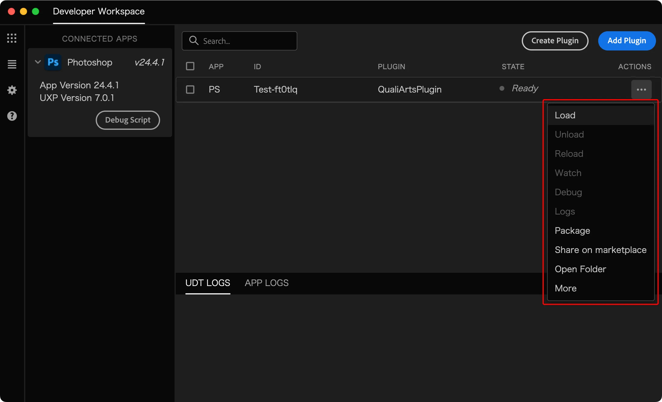 ここまできたら UXP Developer Tools に戻り、「Load」を選択します。これで Photoshop でプラグインが起動できるようになります。また「Watch」を実行しておくことでソースコードを変更した時に即時に変更が反映されるようになります。