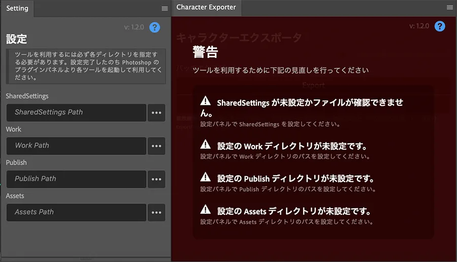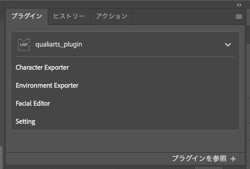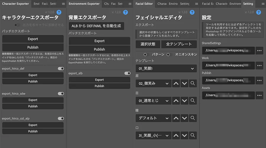 今回移行を行ったプラグインは 3D モデルで使用するテクスチャのエクスポータです。 弊社では、キャラクターモデル用、フェイシャル用、背景モデル用それぞれをわけて用意していました。それに加えてプラグインの設定情報(出力先のパス情報など)を管理する設定パネルも用意しています。 UXP は1つのプラグインの中に複数のパネルを持つことができますので、ユーザーが使用したい機能だけを使うことができるように、機能ごとにパネルをわけて実装しました。