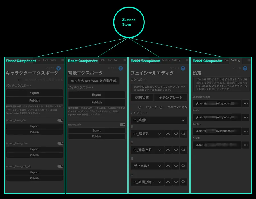 zustand を使って各パネルの動作を他のパネルに伝えています。例えば設定パネルでパスの設定をすると他のパネルでそれを踏まえた形で再レンダリングをするといった使い方をしています。
