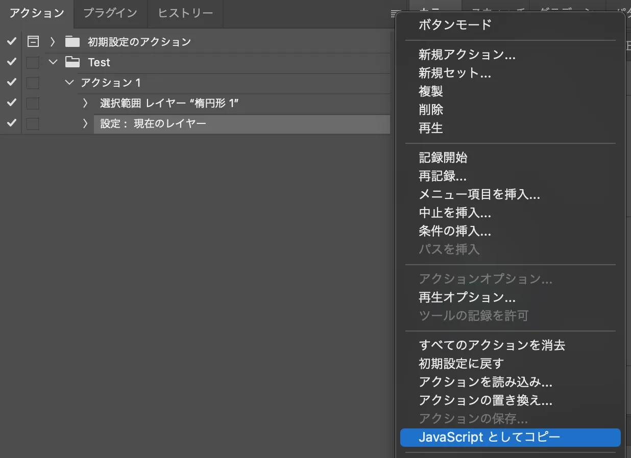 もっとも簡単な方法は Photoshop のアクションを使うことです。知りたいアクションの項目を選択してメニューから「JavaScript としてコピー」を選択するとクリップボードに batchPlay の処理が登録されます。この情報を batchPlay のサンプルとして利用することができます。