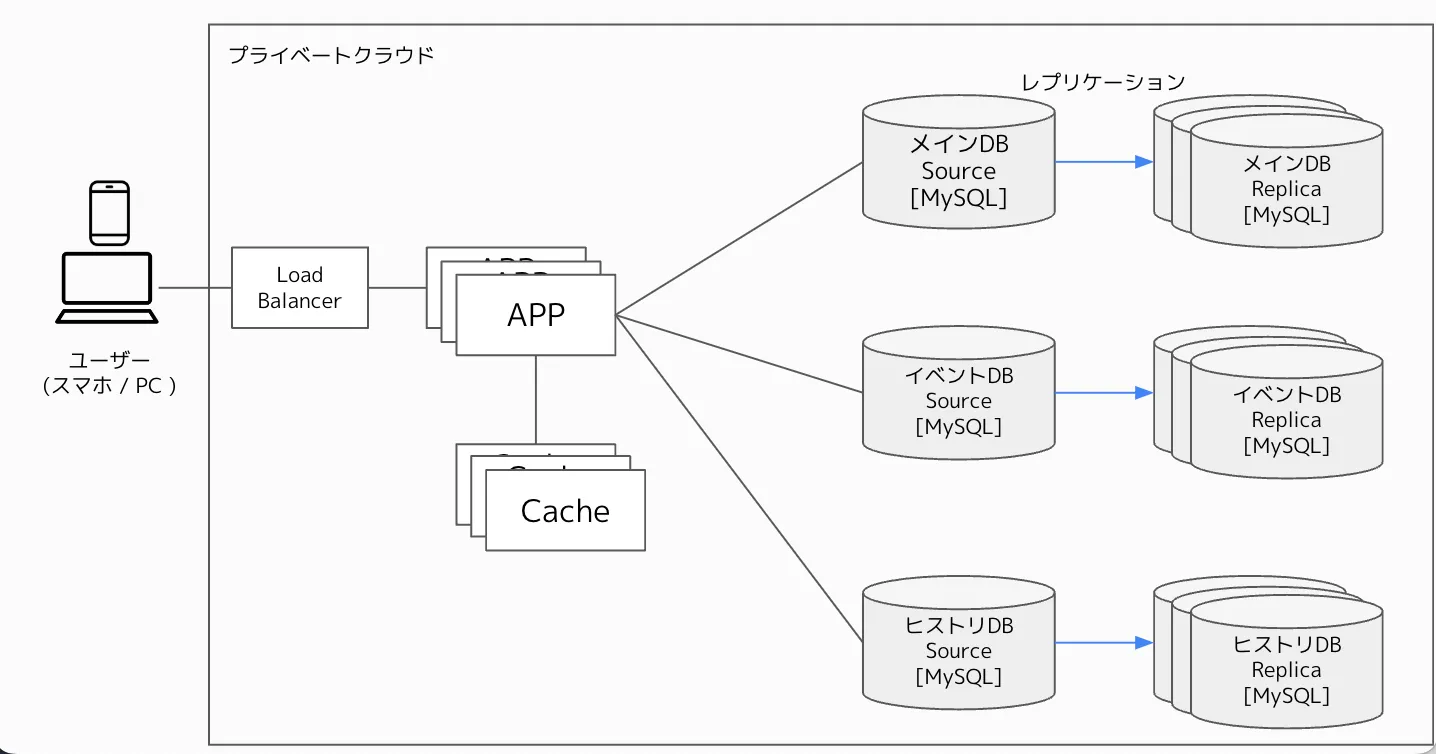 MySQLはメインDB・イベントDB・ヒストリDBの3系統に別れており、それぞれに複数台の参照用のレプリカサーバが存在しています。 構成としては非常にオーソドックスなものとなっています。