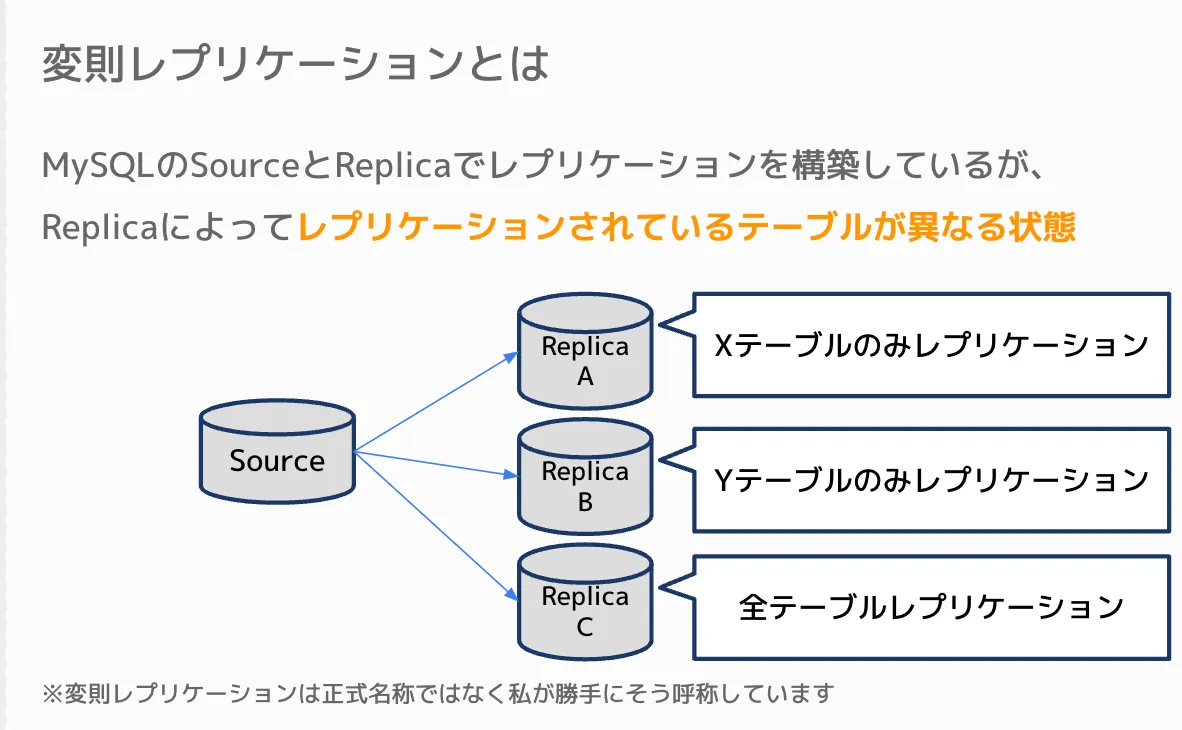 MySQLのソースとレプリカでレプリケーションを構成しているが、レプリカサーバごとにレプリケーションされているテーブルが異なる状態です。 この「変則レプリケーション」は正式名称ではなく、私がそう勝手に呼称しています。