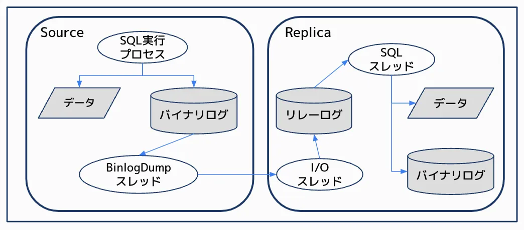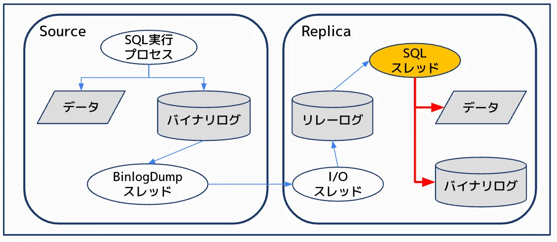 そして、レプリカDBのSQLスレッドがリレーログからバイナリログイベントを取り出し、データに対してリプレイすることでレプリケーションが実現しています。