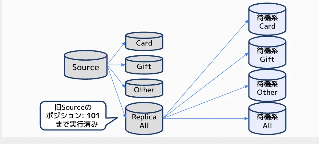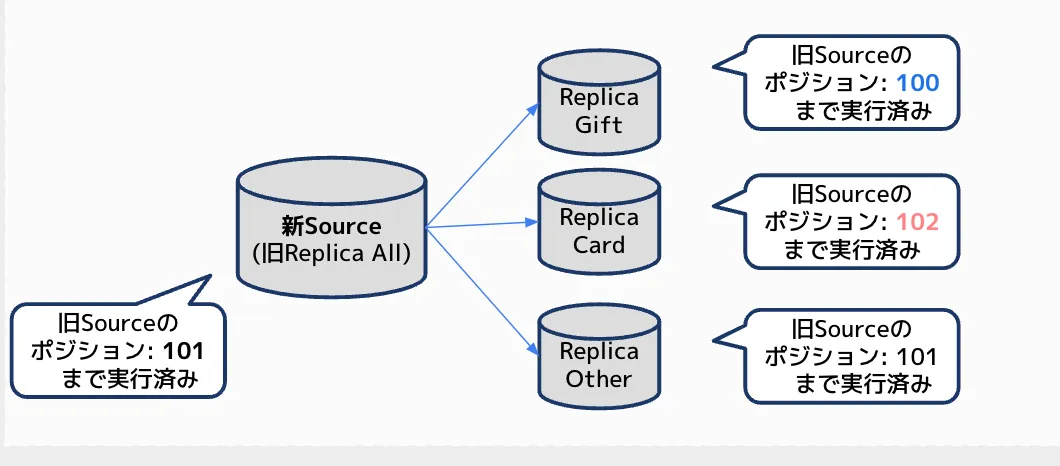 データを全台で揃えるためには、新ソースとなるDBデータをコピー元として全レプリカにデータをコピーしなおしてレプリケーションを再構築する必要があります。