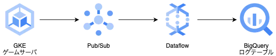 弊プロジェクトでは、インフラ環境にGoogle Cloudを利用しており、ゲームサーバから送られるAPIアクセスログやユーザの行動ログをBigQueryに集約しています。 このゲームサーバからBigQueryのテーブルにログを書き込むために、Cloud Pub/SubとGoogle Cloud Dataflowを採用しています。
